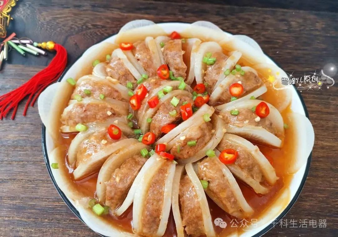 4、鍋中燒開水,上鍋蒸15分鐘左右,熟透后取出,將盤中的湯倒入鍋中,勾芡后舀在蘿卜上,撒上小米椒和切碎的香菜,淋上熱油即可食用。