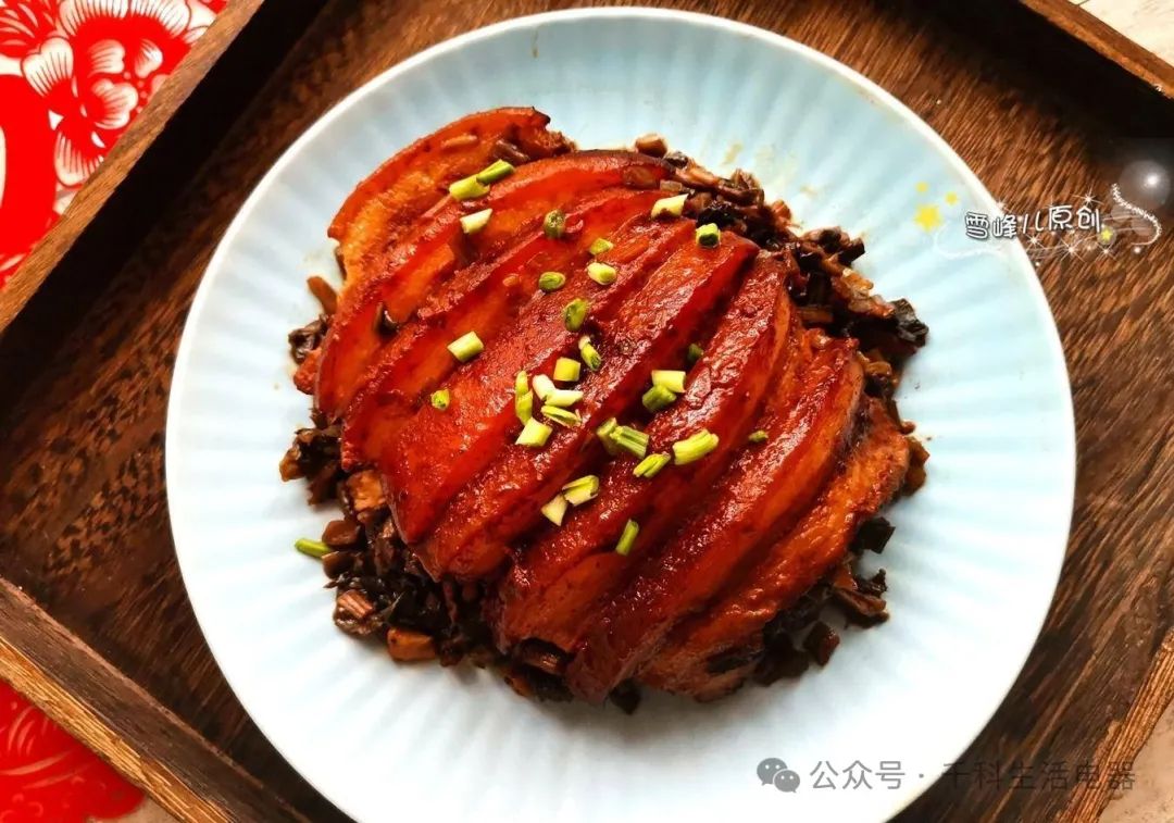 4、取一個(gè)碗,把五花肉皮鋪在碗底,上面放上炸好的梅干,上面淋上一些腌好的肉醬,蒸2小時(shí)左右,取出倒扣的時(shí)候準(zhǔn)備好,在上面撒上切碎的青蒜或小蔥作為裝飾。